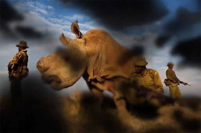 Un rinoceronte bianco si staglia orgoglioso contro un cielo blu nuvoloso. È sorvegliato da tre uomini di colore che indossano tute mimetiche e cappelli abbinati. L'intera scena è parzialmente oscurata da nuvole nere per riprodurre l'esperienza visiva di uno spettatore affetto da retinopatia diabetica