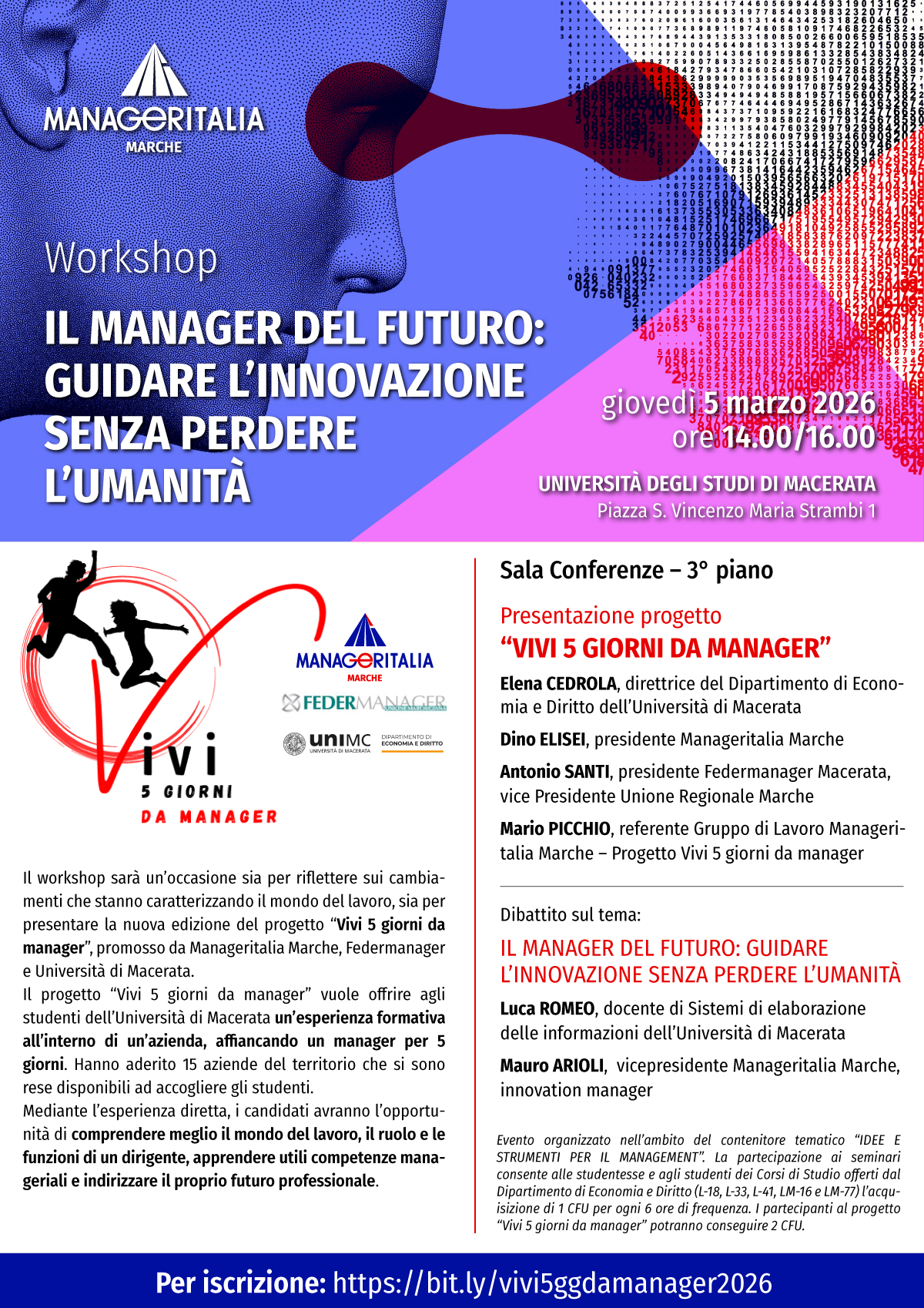 Il progetto sarà presentato ufficialmente nel corso del workshop “Il manager del futuro: guidare l’innovazione senza perdere l’umanità”, in programma giovedì 5 marzo dalle ore 14 alle 16 nella Sala Conferenze dell’Università di Macerata (Piazza Strambi 1). L’incontro rappresenterà un momento di confronto tra mondo accademico e manageriale sui nuovi scenari del mercato del lavoro e sull’evoluzione delle competenze in una fase segnata da innovazione tecnologica e trasformazione digitale.